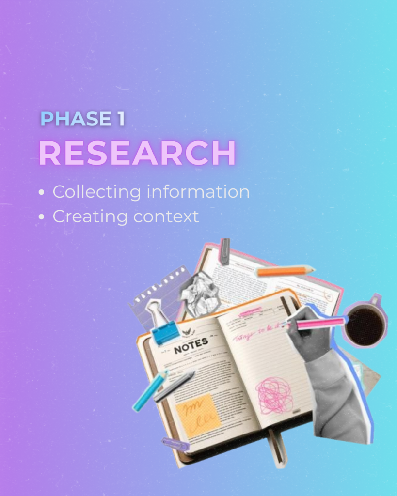 - Research – the conscious gathering of information; understanding the context, goals, and impulses