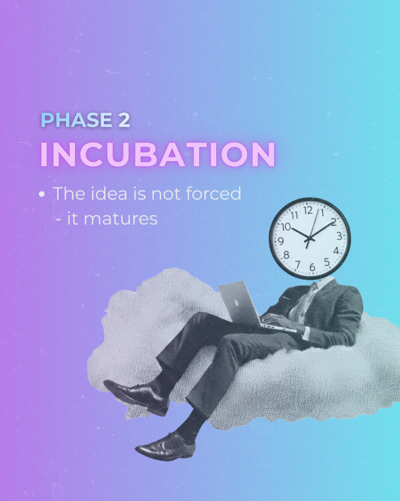 - Incubation – a period in which the idea is not forced, but allowed to “rest,” mature, and find its place and meaning